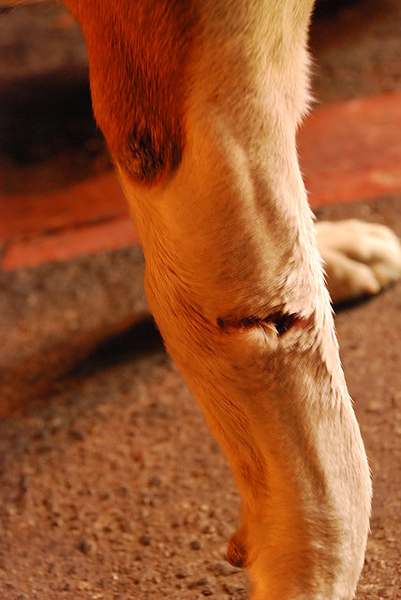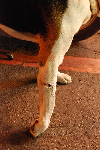 右前腳伸的筆直不敢落在地上,看到我也沒法站起來