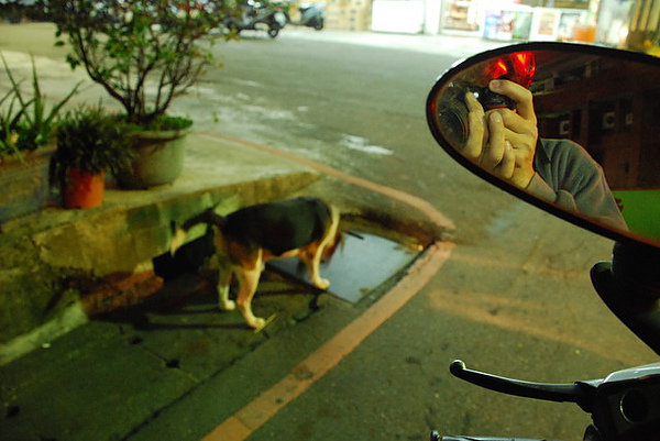昨晚上要回家的時候,我遇見了一位老朋友。每次遇見他,我會拿出機車寶寶肚子中的狗罐頭請他吃