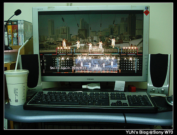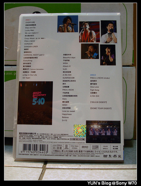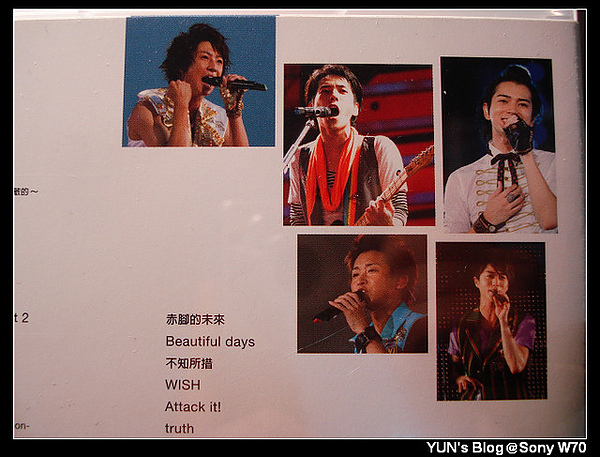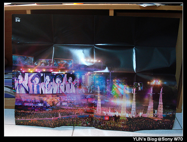 享受預購的樂趣,就是敗家Orz不過可以沉浸在演唱會的感覺裡真的很棒~而且很多歌都聽過更有參與感!正面,難得有許多照片,不過我還是覺得之前的極簡風比較有設計感!光碟兩片是主色特寫一下被紙的字裡面附演唱會海報(反光太多好難拍Orz)PS.由此可以看出J家藝人不能有懼高症喔這時候還是很開心自己換成了寬螢幕只差一個好的音響或耳機~謝謝你們五個帶來新的歡樂喔