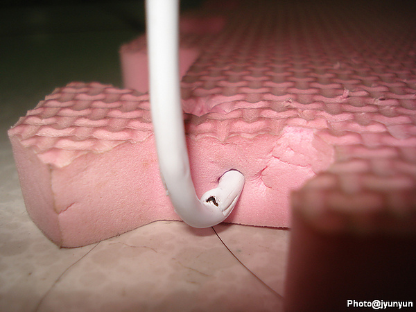 我是在地拼邊緣戳洞在把鐵絲插進去,因為地拼本身彈性的關係所以會把鐵絲夾緊不容易脫落。