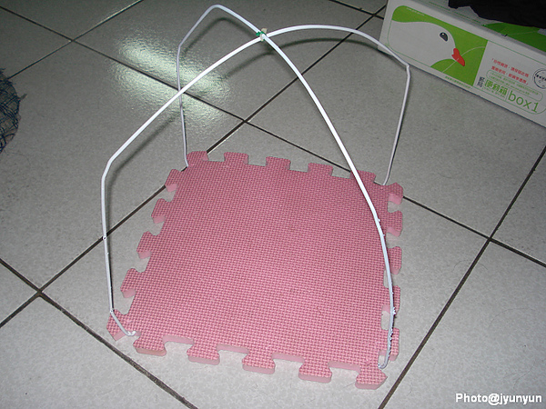 好的,一樣是把衣架彎成直條狀,然後兩條垂直十字分別固定在地拼上。