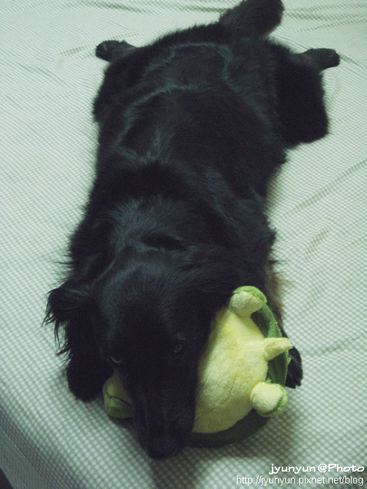 後來黑妞玩一玩累了,就直接枕在翻肚的烏龜上準備入睡