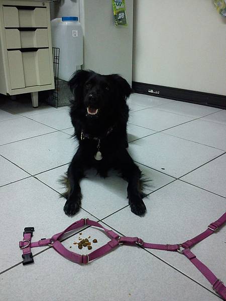 幸好黑妞對於每天的散步路線已經很熟悉不太會衝衝,可以暫用項圈出門