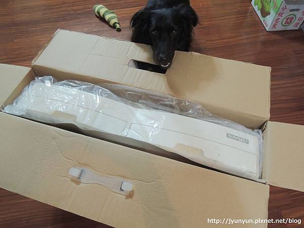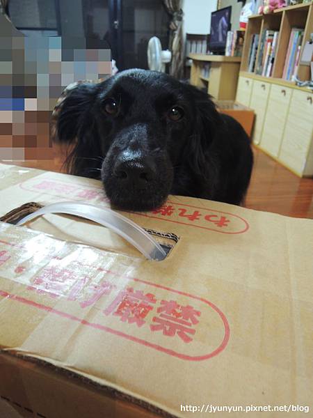 忙著拍照時,有個小妞就自告奮勇的要當開箱犬,自己跑來對箱子頭貼貼.....